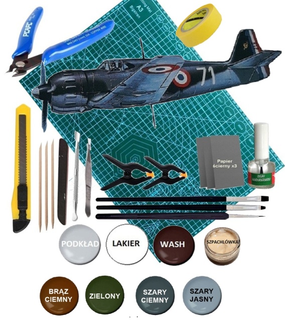 Plastikowe modele redukcyjne z różnym poziomem wyposażenia (farby, kleje, pędzelki, taśma modelarska, różne narzędzia modelarskie)