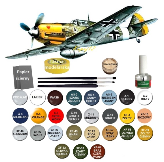 Model samolotu Messerschmitt Bf109E-4/7 Trop. Zestaw podkład, farby, lakier, wash