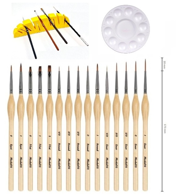 Zestaw 15 pędzelków + uchwyt do odstawiania pędzli + paleta do mieszania kolorów.